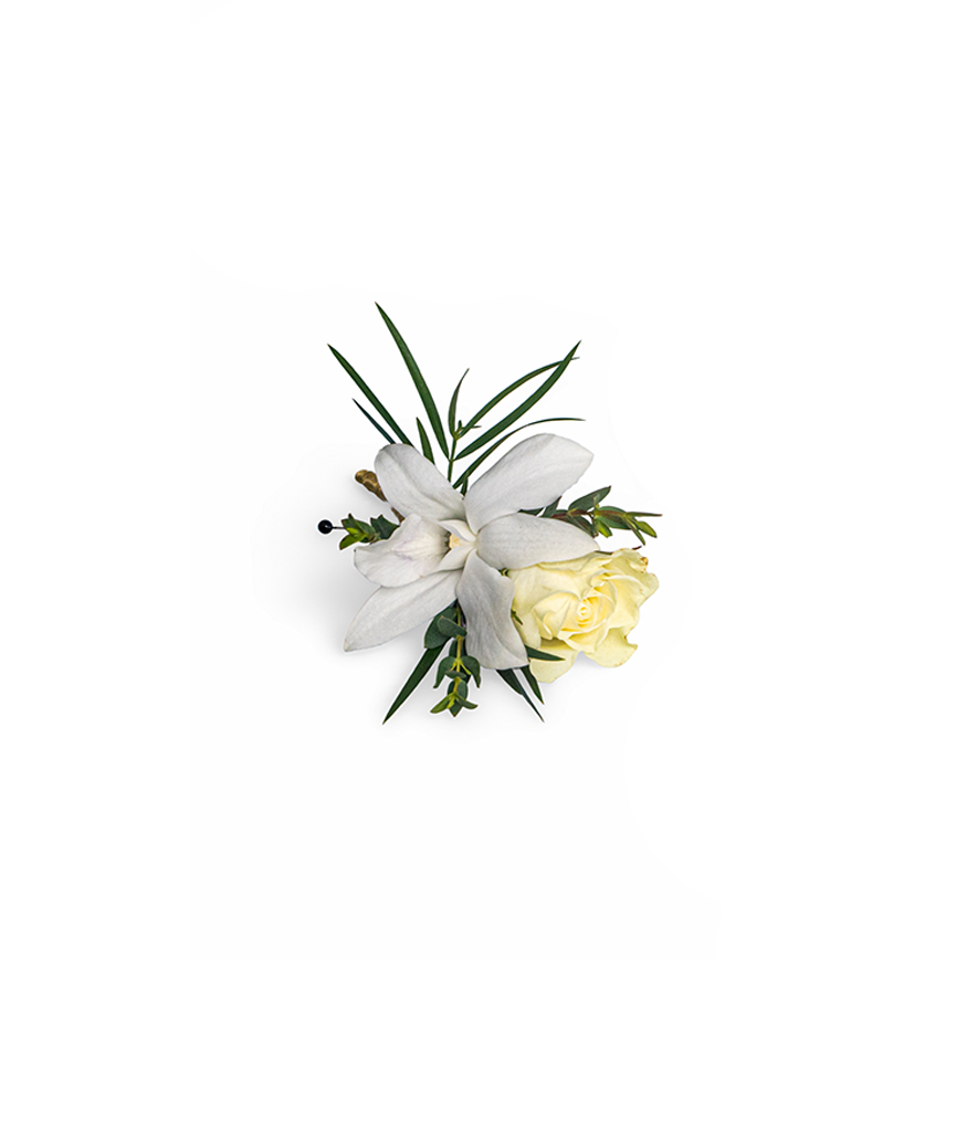 A classic combination of rose and orchid, this boutonniere is thoughtfully designed to complement your date’s gold accessories. Its elegant blooms add a refined touch of style, making it the perfect finishing detail for a polished and memorable look.
