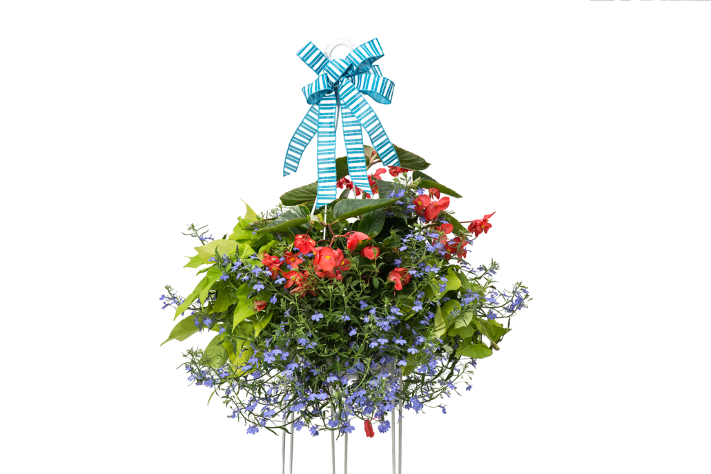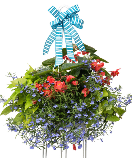 This is a beautiful, homegrown Ludemas original hanging basket that will be a show-stopper on anyone’s porch or patio! Hanging basket will last through the first frost of the fall with part sun to shady conditions, daily water and a fertilizer application 1-2 times per week.
