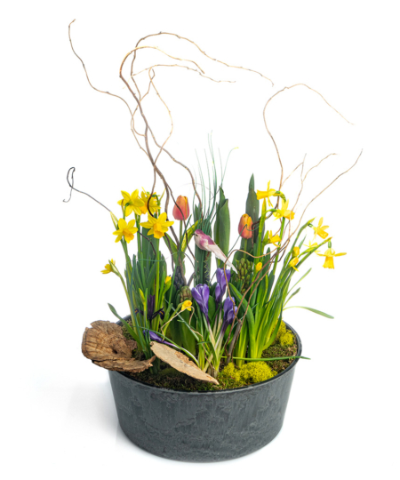 Our most popular option for bulb gardens is this size, which is 13” across and ~22”. It contains a mix of miniature daffodils, tulips, hyacinths, crocus and miniature iris, and is accented with natural touches of locally grown curly willow, dried shelf mushrooms, and a charming bird on a grass pick.
