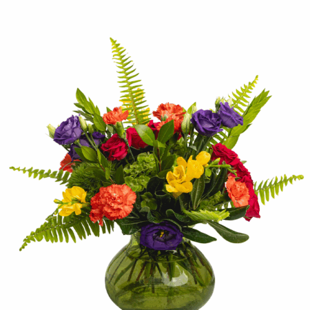 Send a burst of spring with this fun arrangement created with assorted color fresh tulips and whimsical Bear grass in a brightly colored glass vase.